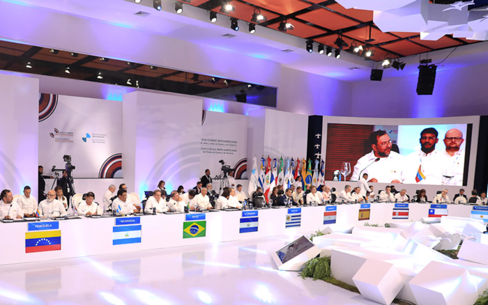 “Deben accionar con más fuerza por el cese y erradicación de la práctica neocolonial de la aplicación de las criminales medidas coercitivas unilaterales, incluidas las personales, como por ejemplo las impuestas por los Estados Unidos o la Unión Europea a tres de los países soberanos que somos miembros de la Conferencia Iberoamericana (Cuba, Nicaragua y Venezuela)”, ejemplificó el diplomático venezolano.